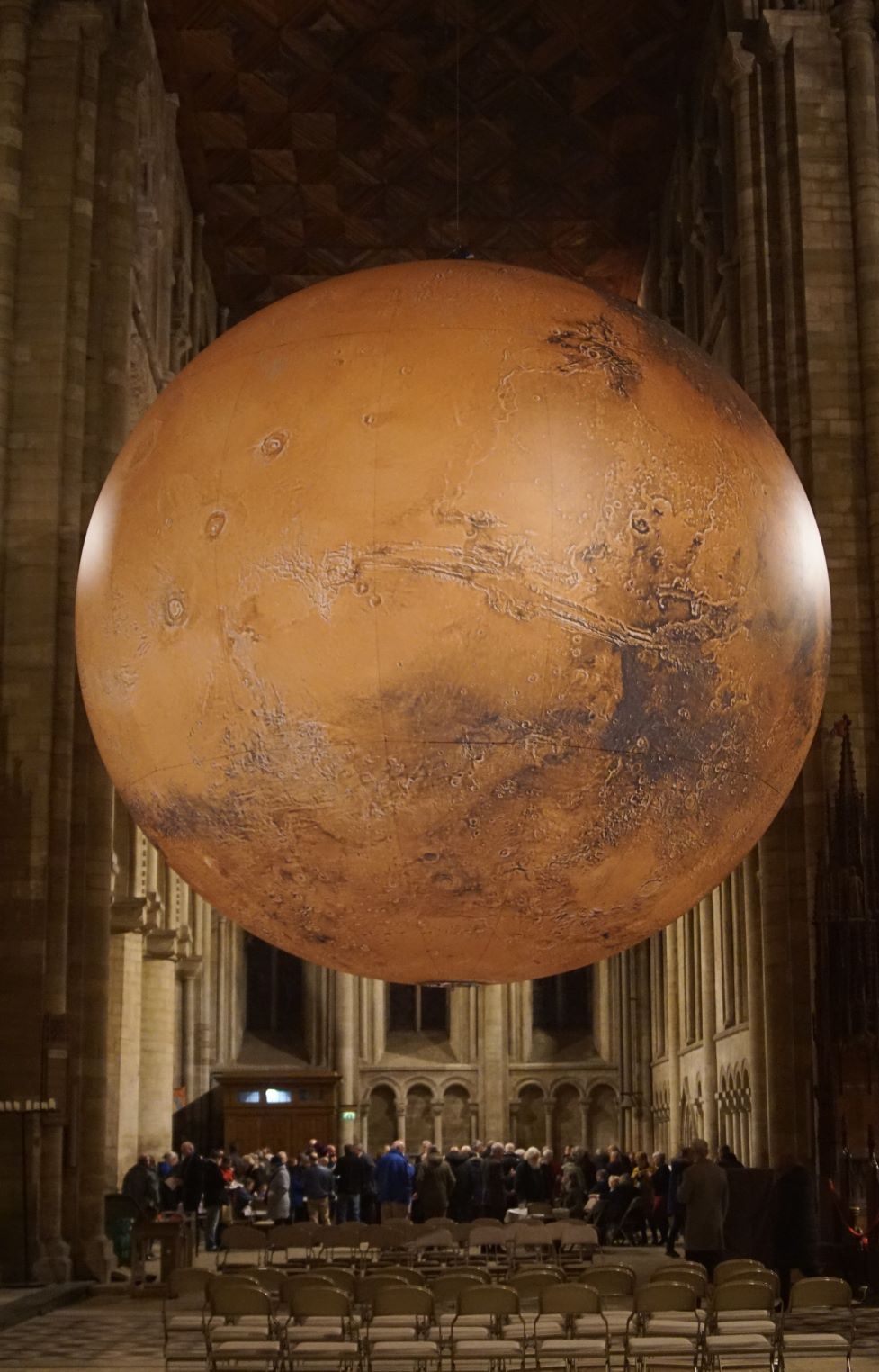 The sculpture of Mars by Luke Jerram over the nave crossing with the reception in the background | The Guild Master and Secretary with representatives from Leicester DG and Bedfordshire Assoc. | One of the Anniversary Cakes. | The President, Secretary and Patron (Bishop of Brixworth) cutting the cake. |
